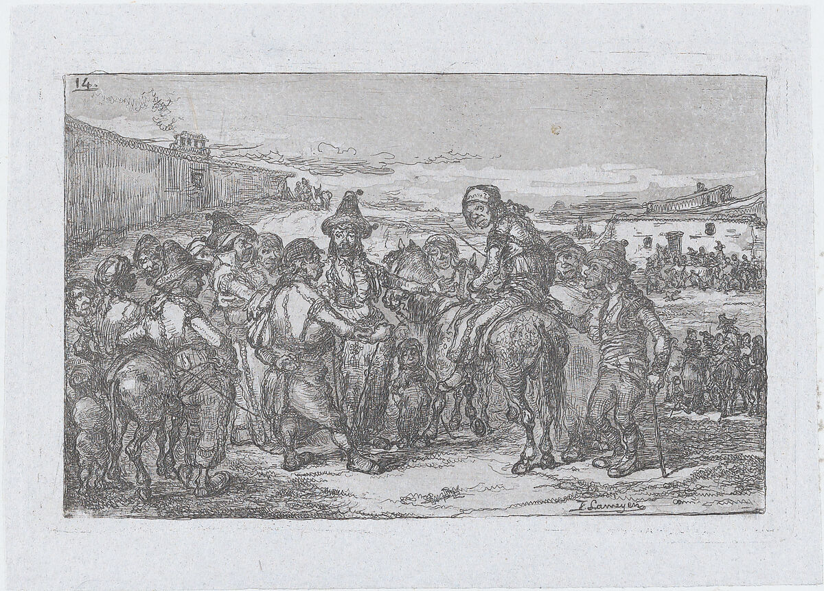- Title: Plate 14: a large group of people outdoors, possibly a troupe of actors, from "Customs and Pastimes of the Spanish People"