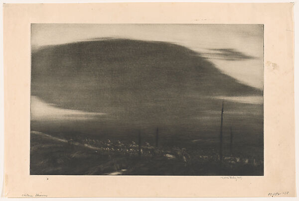 In 1917, soon after America entered the war, Eby enlisted in the army after being denied a commission as a war artist. He drove an ambulance and, later, produced camouflage for artillery. Eby’s unit was part of the 1918 Saint-Mihiel Drive depicted here, an important American counteroffensive against the German army in northeastern France. Strong winds and driving rain made roads difficult to maneuver and tanks inoperable. Eby’s scene emphasizes the dark, heavy cloud that seemed to accompany the advancing American troops, which German soldiers later referred to as a "cloud of blood." Eby returned to the subject in a 1934 print.