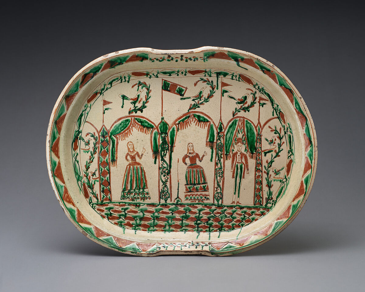 This distinctive type of slip-decorated pottery was produced during the early nineteenth century in Guanajuato, a prosperous town best known for its silver mines. The shallow dish is decorated with the figures of two dancing women and a man standing beneath the draped arches of an arcade topped with flags and surrounded by branches with birds. The unidentified subject is probably a courtship scene.