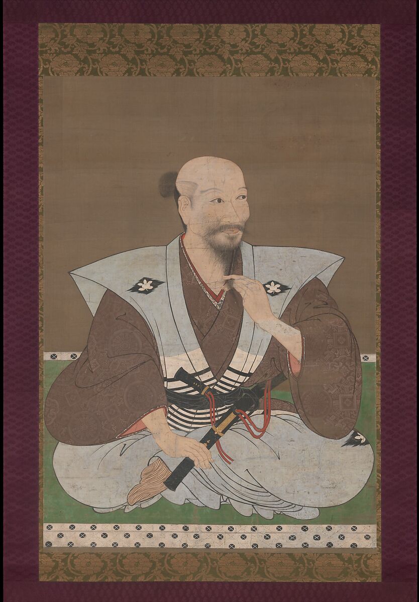 This painting of a warrior is executed at a size usually reserved for portraits of emperors and shoguns. Although the family crest of wild orange is associated with the Shibata family of the late sixteenth century, the original identifying inscription has not survived, so the sitter’s precise identity remains unknown. The unnamed samurai, clearly an important member of a warrior clan, grasps the end of his long beard—a feature banned in the seventeenth century as an expression of antiestablishment sentiment and unwelcome individualism. His eyes seem to twinkle with mischievous pleasure.