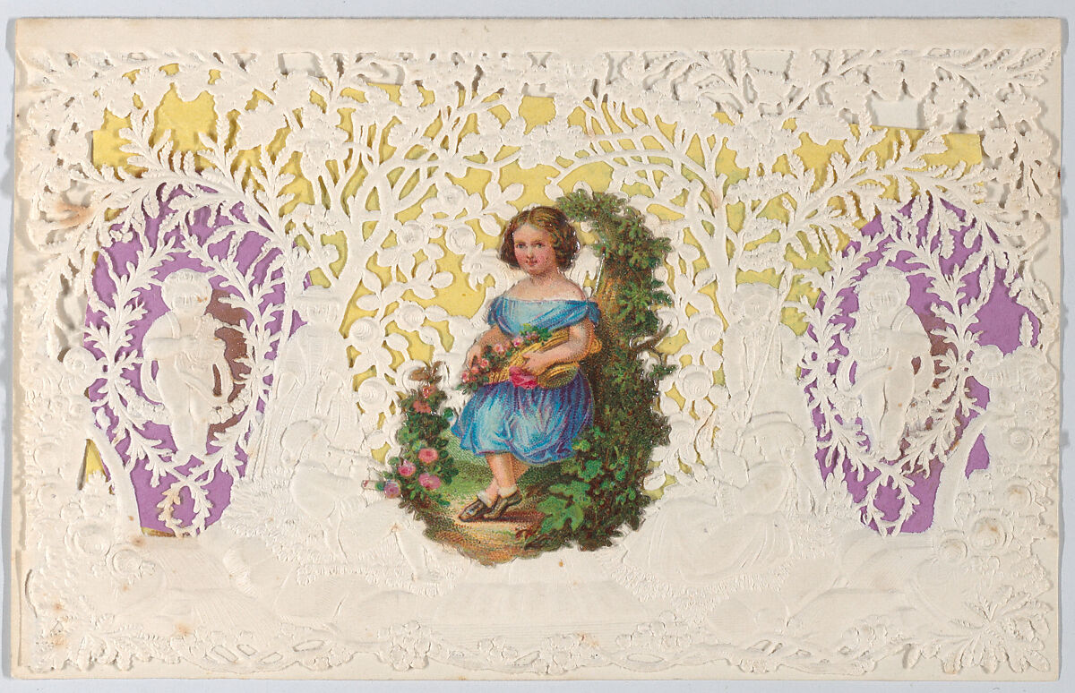 - Medium: Cameo-embossed, open-work lace paper, colored paper, die-cut scraps, ink