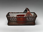 This flower basket, which has a lustrous lacquer finish, displays Rōkansai’s signature thousand-line method, a type of parallel construction (kumi). The asymmetrically positioned handle contrasts with the parallel lines of smoked bamboo strips. The distinctly modern feel of this basket and Rōkansai’s other thousand-line works, which he produced mainly in the middle of his career, derives from their simple shapes and even, rhythmic textures.