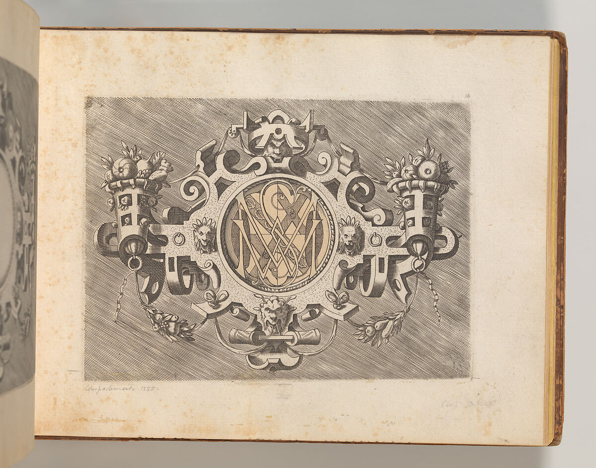 This album contains several print series with designs for strapwork cartouches. The first half of the album consists of plates from the series "Targhe ed altri ornate d varie e cappriciose invenzione (…)", published in Rome by Carlo Losi in 1773. The series is made up out of Italian copies in reverse after several print series originally published in Antwerp in the sixteenth century. The Italian copies were likely made soon after, likely in the context of Antonio Lafreri’s publishing ventures in Rome. Losi obtained the old plates combined them into one series of twenty-five prints. The title plate and following eleven prints are copied after the series "Veelderhande cierlijcke Compertimenten (…)", designed by Jacob Floris and published by Hans Liefrinck in 1564. These are followed by copies in reverse (with some alterations) after Hans Vredeman de Vries’ series "Variarum Protractionum", first published by Gerard de Jode in 1555. Most, but not all of these plates, are accompanied by a second impression of the same print on the facing page. These are darker in tone, and pasted onto a thicker sheet of paper, rather than printed directly onto the album page. They may derive from an earlier edition of the Italian series, although they do not contain inscriptions that refer to Lafreri or Iacomo Marucci who are known to have owned the plates before Losi. In one case, Losi’s plate is combined with a copy in reverse in a less accomplished hand. The second half of the album consists of a series of smaller prints containing strapwork cartouches with masks and short inscriptions in French, often attributed to Cornelis Bos. However, two versions of this series were produced during the sixteenth century: one with the cartouches on a blank ground, and one with the images in reverse and presented on a hatched ground. The latter versions is the one included in this album, which is further distinguished by the fact that it features landscapes instead of inscriptions in those cases where the compartment was filled with a text alone. This feature is reminiscent of various prints of the so-called School of Fontainebleau. One outlier is formed by a cartouche with and alphabet in majuscules. The design of the cartouche is close to those designed by the enigmatic artists Benedetto Battini for Hieronymus Cock’s 1553 series of strapwork cartouches with quotations in Latin, but it is not a copy. This print is signed with the initials of the French artist Georges Reverdy, which has previously led to the idea that Reverdy might be the artist responsible for the entire series of cartouches on a hatched ground. The difference in the execution of the prints speaks against this hypothesis, however.