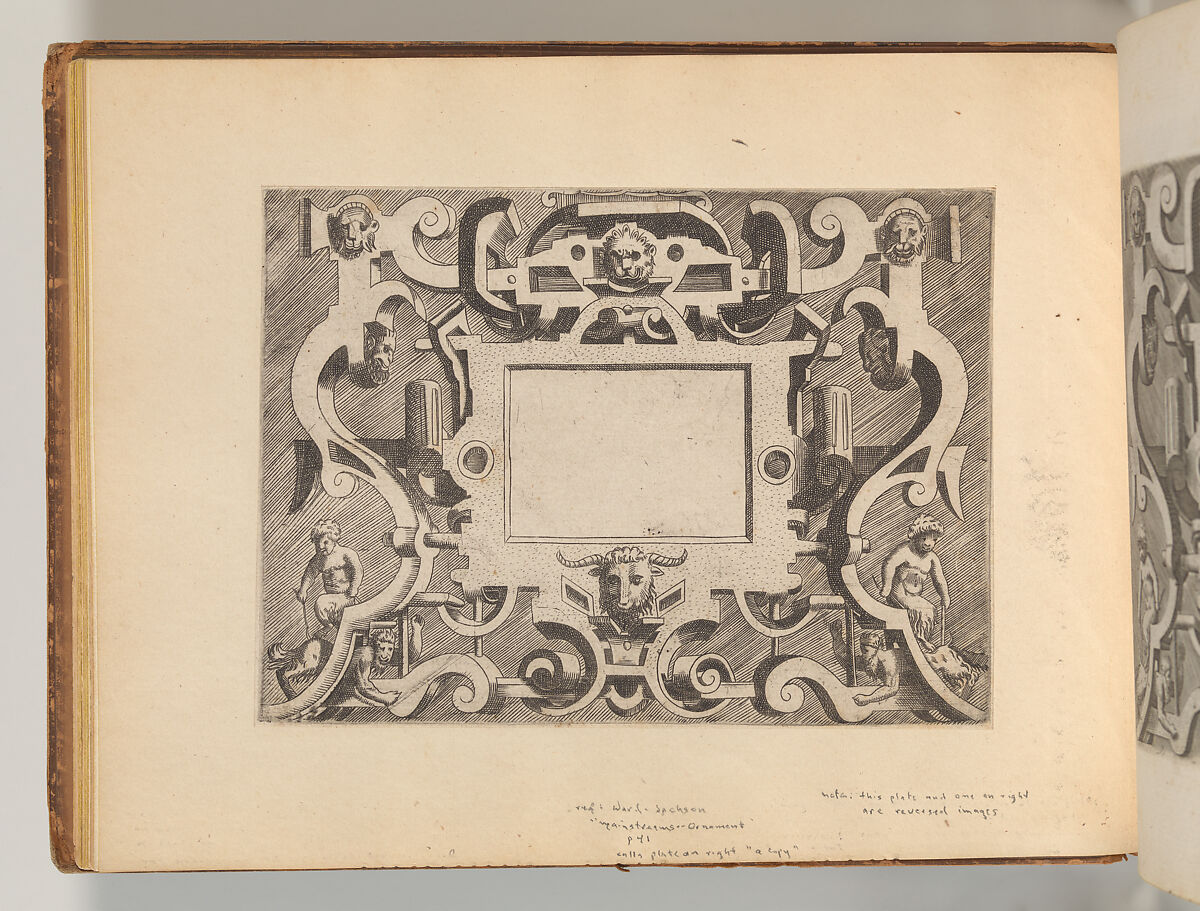 This album contains several print series with designs for strapwork cartouches. The first half of the album consists of plates from the series "Targhe ed altri ornate d varie e cappriciose invenzione (…)", published in Rome by Carlo Losi in 1773. The series is made up out of Italian copies in reverse after several print series originally published in Antwerp in the sixteenth century. The Italian copies were likely made soon after, likely in the context of Antonio Lafreri’s publishing ventures in Rome. Losi obtained the old plates combined them into one series of twenty-five prints. The title plate and following eleven prints are copied after the series "Veelderhande cierlijcke Compertimenten (…)", designed by Jacob Floris and published by Hans Liefrinck in 1564. These are followed by copies in reverse (with some alterations) after Hans Vredeman de Vries’ series "Variarum Protractionum", first published by Gerard de Jode in 1555. Most, but not all of these plates, are accompanied by a second impression of the same print on the facing page. These are darker in tone, and pasted onto a thicker sheet of paper, rather than printed directly onto the album page. They may derive from an earlier edition of the Italian series, although they do not contain inscriptions that refer to Lafreri or Iacomo Marucci who are known to have owned the plates before Losi. In one case, Losi’s plate is combined with a copy in reverse in a less accomplished hand. The second half of the album consists of a series of smaller prints containing strapwork cartouches with masks and short inscriptions in French, often attributed to Cornelis Bos. However, two versions of this series were produced during the sixteenth century: one with the cartouches on a blank ground, and one with the images in reverse and presented on a hatched ground. The latter versions is the one included in this album, which is further distinguished by the fact that it features landscapes instead of inscriptions in those cases where the compartment was filled with a text alone. This feature is reminiscent of various prints of the so-called School of Fontainebleau. One outlier is formed by a cartouche with and alphabet in majuscules. The design of the cartouche is close to those designed by the enigmatic artists Benedetto Battini for Hieronymus Cock’s 1553 series of strapwork cartouches with quotations in Latin, but it is not a copy. This print is signed with the initials of the French artist Georges Reverdy, which has previously led to the idea that Reverdy might be the artist responsible for the entire series of cartouches on a hatched ground. The difference in the execution of the prints speaks against this hypothesis, however.