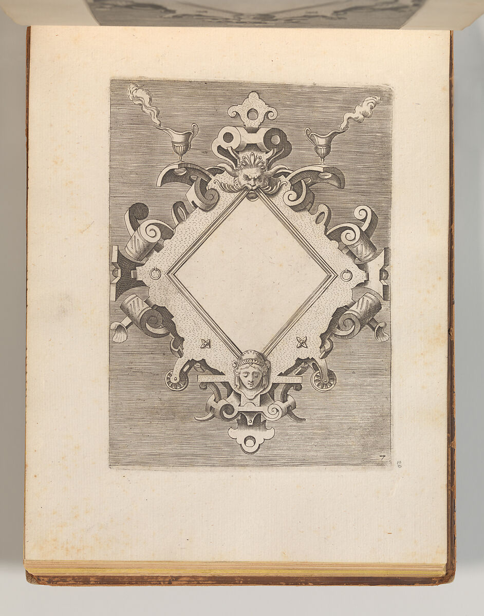 This album contains several print series with designs for strapwork cartouches. The first half of the album consists of plates from the series "Targhe ed altri ornate d varie e cappriciose invenzione (…)", published in Rome by Carlo Losi in 1773. The series is made up out of Italian copies in reverse after several print series originally published in Antwerp in the sixteenth century. The Italian copies were likely made soon after, likely in the context of Antonio Lafreri’s publishing ventures in Rome. Losi obtained the old plates combined them into one series of twenty-five prints. The title plate and following eleven prints are copied after the series "Veelderhande cierlijcke Compertimenten (…)", designed by Jacob Floris and published by Hans Liefrinck in 1564. These are followed by copies in reverse (with some alterations) after Hans Vredeman de Vries’ series "Variarum Protractionum", first published by Gerard de Jode in 1555. Most, but not all of these plates, are accompanied by a second impression of the same print on the facing page. These are darker in tone, and pasted onto a thicker sheet of paper, rather than printed directly onto the album page. They may derive from an earlier edition of the Italian series, although they do not contain inscriptions that refer to Lafreri or Iacomo Marucci who are known to have owned the plates before Losi. In one case, Losi’s plate is combined with a copy in reverse in a less accomplished hand. The second half of the album consists of a series of smaller prints containing strapwork cartouches with masks and short inscriptions in French, often attributed to Cornelis Bos. However, two versions of this series were produced during the sixteenth century: one with the cartouches on a blank ground, and one with the images in reverse and presented on a hatched ground. The latter versions is the one included in this album, which is further distinguished by the fact that it features landscapes instead of inscriptions in those cases where the compartment was filled with a text alone. This feature is reminiscent of various prints of the so-called School of Fontainebleau. One outlier is formed by a cartouche with and alphabet in majuscules. The design of the cartouche is close to those designed by the enigmatic artists Benedetto Battini for Hieronymus Cock’s 1553 series of strapwork cartouches with quotations in Latin, but it is not a copy. This print is signed with the initials of the French artist Georges Reverdy, which has previously led to the idea that Reverdy might be the artist responsible for the entire series of cartouches on a hatched ground. The difference in the execution of the prints speaks against this hypothesis, however.