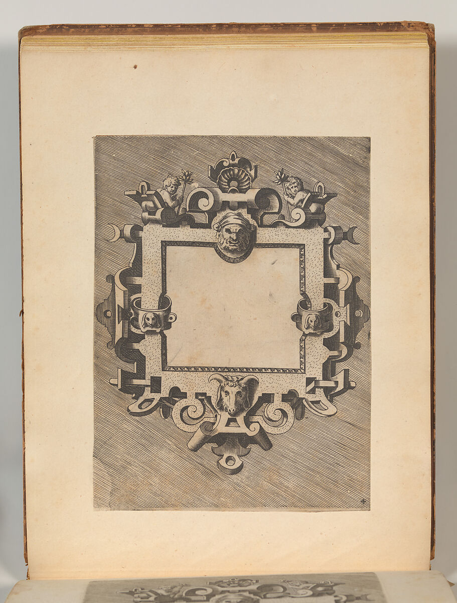 This album contains several print series with designs for strapwork cartouches. The first half of the album consists of plates from the series "Targhe ed altri ornate d varie e cappriciose invenzione (…)", published in Rome by Carlo Losi in 1773. The series is made up out of Italian copies in reverse after several print series originally published in Antwerp in the sixteenth century. The Italian copies were likely made soon after, likely in the context of Antonio Lafreri’s publishing ventures in Rome. Losi obtained the old plates combined them into one series of twenty-five prints. The title plate and following eleven prints are copied after the series "Veelderhande cierlijcke Compertimenten (…)", designed by Jacob Floris and published by Hans Liefrinck in 1564. These are followed by copies in reverse (with some alterations) after Hans Vredeman de Vries’ series "Variarum Protractionum", first published by Gerard de Jode in 1555. Most, but not all of these plates, are accompanied by a second impression of the same print on the facing page. These are darker in tone, and pasted onto a thicker sheet of paper, rather than printed directly onto the album page. They may derive from an earlier edition of the Italian series, although they do not contain inscriptions that refer to Lafreri or Iacomo Marucci who are known to have owned the plates before Losi. In one case, Losi’s plate is combined with a copy in reverse in a less accomplished hand. The second half of the album consists of a series of smaller prints containing strapwork cartouches with masks and short inscriptions in French, often attributed to Cornelis Bos. However, two versions of this series were produced during the sixteenth century: one with the cartouches on a blank ground, and one with the images in reverse and presented on a hatched ground. The latter versions is the one included in this album, which is further distinguished by the fact that it features landscapes instead of inscriptions in those cases where the compartment was filled with a text alone. This feature is reminiscent of various prints of the so-called School of Fontainebleau. One outlier is formed by a cartouche with and alphabet in majuscules. The design of the cartouche is close to those designed by the enigmatic artists Benedetto Battini for Hieronymus Cock’s 1553 series of strapwork cartouches with quotations in Latin, but it is not a copy. This print is signed with the initials of the French artist Georges Reverdy, which has previously led to the idea that Reverdy might be the artist responsible for the entire series of cartouches on a hatched ground. The difference in the execution of the prints speaks against this hypothesis, however.