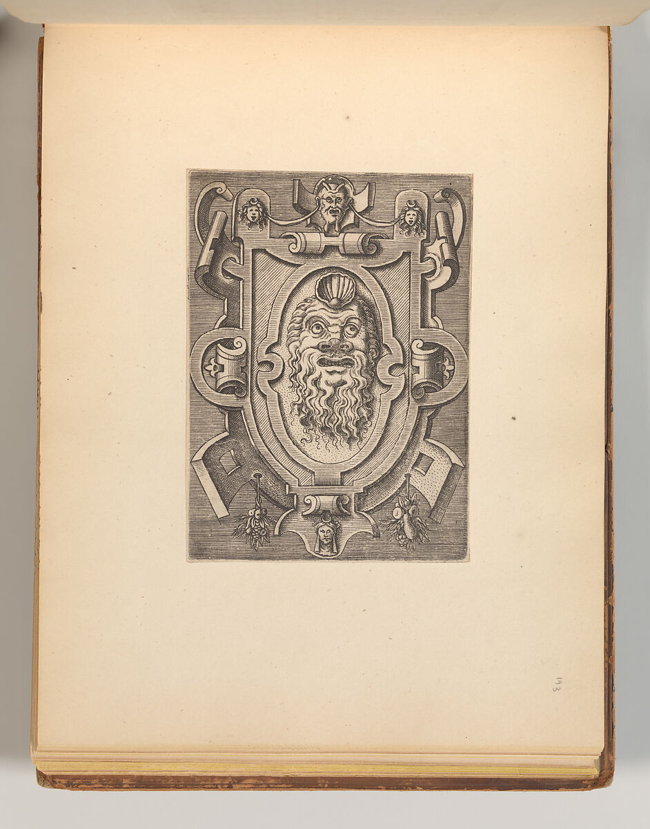 This album contains several print series with designs for strapwork cartouches. The first half of the album consists of plates from the series "Targhe ed altri ornate d varie e cappriciose invenzione (…)", published in Rome by Carlo Losi in 1773. The series is made up out of Italian copies in reverse after several print series originally published in Antwerp in the sixteenth century. The Italian copies were likely made soon after, likely in the context of Antonio Lafreri’s publishing ventures in Rome. Losi obtained the old plates combined them into one series of twenty-five prints. The title plate and following eleven prints are copied after the series "Veelderhande cierlijcke Compertimenten (…)", designed by Jacob Floris and published by Hans Liefrinck in 1564. These are followed by copies in reverse (with some alterations) after Hans Vredeman de Vries’ series "Variarum Protractionum", first published by Gerard de Jode in 1555. Most, but not all of these plates, are accompanied by a second impression of the same print on the facing page. These are darker in tone, and pasted onto a thicker sheet of paper, rather than printed directly onto the album page. They may derive from an earlier edition of the Italian series, although they do not contain inscriptions that refer to Lafreri or Iacomo Marucci who are known to have owned the plates before Losi. In one case, Losi’s plate is combined with a copy in reverse in a less accomplished hand. The second half of the album consists of a series of smaller prints containing strapwork cartouches with masks and short inscriptions in French, often attributed to Cornelis Bos. However, two versions of this series were produced during the sixteenth century: one with the cartouches on a blank ground, and one with the images in reverse and presented on a hatched ground. The latter versions is the one included in this album, which is further distinguished by the fact that it features landscapes instead of inscriptions in those cases where the compartment was filled with a text alone. This feature is reminiscent of various prints of the so-called School of Fontainebleau. One outlier is formed by a cartouche with and alphabet in majuscules. The design of the cartouche is close to those designed by the enigmatic artists Benedetto Battini for Hieronymus Cock’s 1553 series of strapwork cartouches with quotations in Latin, but it is not a copy. This print is signed with the initials of the French artist Georges Reverdy, which has previously led to the idea that Reverdy might be the artist responsible for the entire series of cartouches on a hatched ground. The difference in the execution of the prints speaks against this hypothesis, however.