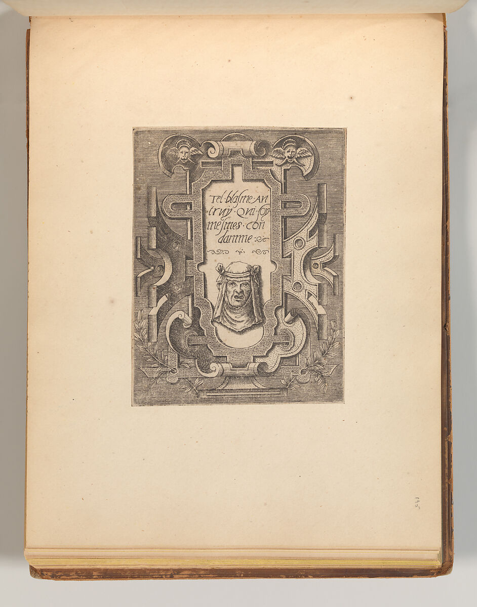 This album contains several print series with designs for strapwork cartouches. The first half of the album consists of plates from the series "Targhe ed altri ornate d varie e cappriciose invenzione (…)", published in Rome by Carlo Losi in 1773. The series is made up out of Italian copies in reverse after several print series originally published in Antwerp in the sixteenth century. The Italian copies were likely made soon after, likely in the context of Antonio Lafreri’s publishing ventures in Rome. Losi obtained the old plates combined them into one series of twenty-five prints. The title plate and following eleven prints are copied after the series "Veelderhande cierlijcke Compertimenten (…)", designed by Jacob Floris and published by Hans Liefrinck in 1564. These are followed by copies in reverse (with some alterations) after Hans Vredeman de Vries’ series "Variarum Protractionum", first published by Gerard de Jode in 1555. Most, but not all of these plates, are accompanied by a second impression of the same print on the facing page. These are darker in tone, and pasted onto a thicker sheet of paper, rather than printed directly onto the album page. They may derive from an earlier edition of the Italian series, although they do not contain inscriptions that refer to Lafreri or Iacomo Marucci who are known to have owned the plates before Losi. In one case, Losi’s plate is combined with a copy in reverse in a less accomplished hand. The second half of the album consists of a series of smaller prints containing strapwork cartouches with masks and short inscriptions in French, often attributed to Cornelis Bos. However, two versions of this series were produced during the sixteenth century: one with the cartouches on a blank ground, and one with the images in reverse and presented on a hatched ground. The latter versions is the one included in this album, which is further distinguished by the fact that it features landscapes instead of inscriptions in those cases where the compartment was filled with a text alone. This feature is reminiscent of various prints of the so-called School of Fontainebleau. One outlier is formed by a cartouche with and alphabet in majuscules. The design of the cartouche is close to those designed by the enigmatic artists Benedetto Battini for Hieronymus Cock’s 1553 series of strapwork cartouches with quotations in Latin, but it is not a copy. This print is signed with the initials of the French artist Georges Reverdy, which has previously led to the idea that Reverdy might be the artist responsible for the entire series of cartouches on a hatched ground. The difference in the execution of the prints speaks against this hypothesis, however.