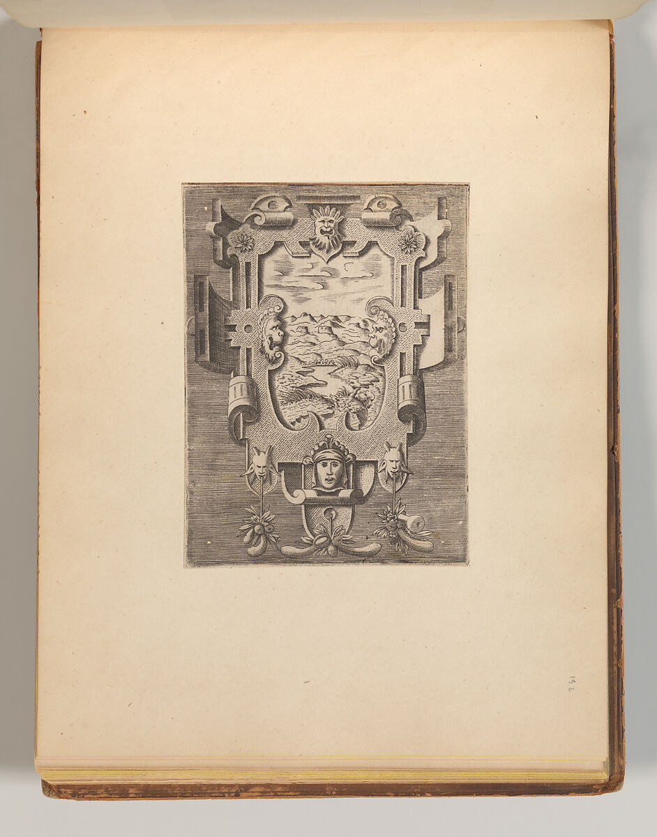 This album contains several print series with designs for strapwork cartouches. The first half of the album consists of plates from the series "Targhe ed altri ornate d varie e cappriciose invenzione (…)", published in Rome by Carlo Losi in 1773. The series is made up out of Italian copies in reverse after several print series originally published in Antwerp in the sixteenth century. The Italian copies were likely made soon after, likely in the context of Antonio Lafreri’s publishing ventures in Rome. Losi obtained the old plates combined them into one series of twenty-five prints. The title plate and following eleven prints are copied after the series "Veelderhande cierlijcke Compertimenten (…)", designed by Jacob Floris and published by Hans Liefrinck in 1564. These are followed by copies in reverse (with some alterations) after Hans Vredeman de Vries’ series "Variarum Protractionum", first published by Gerard de Jode in 1555. Most, but not all of these plates, are accompanied by a second impression of the same print on the facing page. These are darker in tone, and pasted onto a thicker sheet of paper, rather than printed directly onto the album page. They may derive from an earlier edition of the Italian series, although they do not contain inscriptions that refer to Lafreri or Iacomo Marucci who are known to have owned the plates before Losi. In one case, Losi’s plate is combined with a copy in reverse in a less accomplished hand. The second half of the album consists of a series of smaller prints containing strapwork cartouches with masks and short inscriptions in French, often attributed to Cornelis Bos. However, two versions of this series were produced during the sixteenth century: one with the cartouches on a blank ground, and one with the images in reverse and presented on a hatched ground. The latter versions is the one included in this album, which is further distinguished by the fact that it features landscapes instead of inscriptions in those cases where the compartment was filled with a text alone. This feature is reminiscent of various prints of the so-called School of Fontainebleau. One outlier is formed by a cartouche with and alphabet in majuscules. The design of the cartouche is close to those designed by the enigmatic artists Benedetto Battini for Hieronymus Cock’s 1553 series of strapwork cartouches with quotations in Latin, but it is not a copy. This print is signed with the initials of the French artist Georges Reverdy, which has previously led to the idea that Reverdy might be the artist responsible for the entire series of cartouches on a hatched ground. The difference in the execution of the prints speaks against this hypothesis, however.