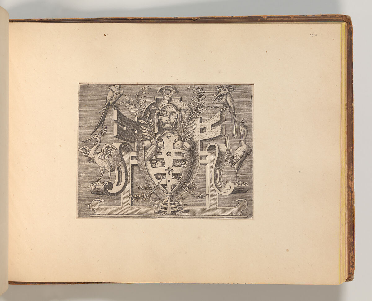 This album contains several print series with designs for strapwork cartouches. The first half of the album consists of plates from the series "Targhe ed altri ornate d varie e cappriciose invenzione (…)", published in Rome by Carlo Losi in 1773. The series is made up out of Italian copies in reverse after several print series originally published in Antwerp in the sixteenth century. The Italian copies were likely made soon after, likely in the context of Antonio Lafreri’s publishing ventures in Rome. Losi obtained the old plates combined them into one series of twenty-five prints. The title plate and following eleven prints are copied after the series "Veelderhande cierlijcke Compertimenten (…)", designed by Jacob Floris and published by Hans Liefrinck in 1564. These are followed by copies in reverse (with some alterations) after Hans Vredeman de Vries’ series "Variarum Protractionum", first published by Gerard de Jode in 1555. Most, but not all of these plates, are accompanied by a second impression of the same print on the facing page. These are darker in tone, and pasted onto a thicker sheet of paper, rather than printed directly onto the album page. They may derive from an earlier edition of the Italian series, although they do not contain inscriptions that refer to Lafreri or Iacomo Marucci who are known to have owned the plates before Losi. In one case, Losi’s plate is combined with a copy in reverse in a less accomplished hand. The second half of the album consists of a series of smaller prints containing strapwork cartouches with masks and short inscriptions in French, often attributed to Cornelis Bos. However, two versions of this series were produced during the sixteenth century: one with the cartouches on a blank ground, and one with the images in reverse and presented on a hatched ground. The latter versions is the one included in this album, which is further distinguished by the fact that it features landscapes instead of inscriptions in those cases where the compartment was filled with a text alone. This feature is reminiscent of various prints of the so-called School of Fontainebleau. One outlier is formed by a cartouche with and alphabet in majuscules. The design of the cartouche is close to those designed by the enigmatic artists Benedetto Battini for Hieronymus Cock’s 1553 series of strapwork cartouches with quotations in Latin, but it is not a copy. This print is signed with the initials of the French artist Georges Reverdy, which has previously led to the idea that Reverdy might be the artist responsible for the entire series of cartouches on a hatched ground. The difference in the execution of the prints speaks against this hypothesis, however.