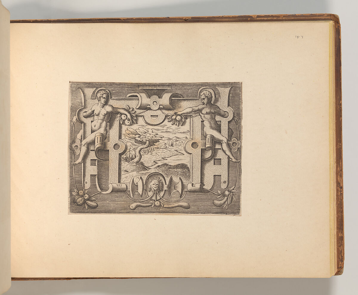 This album contains several print series with designs for strapwork cartouches. The first half of the album consists of plates from the series "Targhe ed altri ornate d varie e cappriciose invenzione (…)", published in Rome by Carlo Losi in 1773. The series is made up out of Italian copies in reverse after several print series originally published in Antwerp in the sixteenth century. The Italian copies were likely made soon after, likely in the context of Antonio Lafreri’s publishing ventures in Rome. Losi obtained the old plates combined them into one series of twenty-five prints. The title plate and following eleven prints are copied after the series "Veelderhande cierlijcke Compertimenten (…)", designed by Jacob Floris and published by Hans Liefrinck in 1564. These are followed by copies in reverse (with some alterations) after Hans Vredeman de Vries’ series "Variarum Protractionum", first published by Gerard de Jode in 1555. Most, but not all of these plates, are accompanied by a second impression of the same print on the facing page. These are darker in tone, and pasted onto a thicker sheet of paper, rather than printed directly onto the album page. They may derive from an earlier edition of the Italian series, although they do not contain inscriptions that refer to Lafreri or Iacomo Marucci who are known to have owned the plates before Losi. In one case, Losi’s plate is combined with a copy in reverse in a less accomplished hand. The second half of the album consists of a series of smaller prints containing strapwork cartouches with masks and short inscriptions in French, often attributed to Cornelis Bos. However, two versions of this series were produced during the sixteenth century: one with the cartouches on a blank ground, and one with the images in reverse and presented on a hatched ground. The latter versions is the one included in this album, which is further distinguished by the fact that it features landscapes instead of inscriptions in those cases where the compartment was filled with a text alone. This feature is reminiscent of various prints of the so-called School of Fontainebleau. One outlier is formed by a cartouche with and alphabet in majuscules. The design of the cartouche is close to those designed by the enigmatic artists Benedetto Battini for Hieronymus Cock’s 1553 series of strapwork cartouches with quotations in Latin, but it is not a copy. This print is signed with the initials of the French artist Georges Reverdy, which has previously led to the idea that Reverdy might be the artist responsible for the entire series of cartouches on a hatched ground. The difference in the execution of the prints speaks against this hypothesis, however.