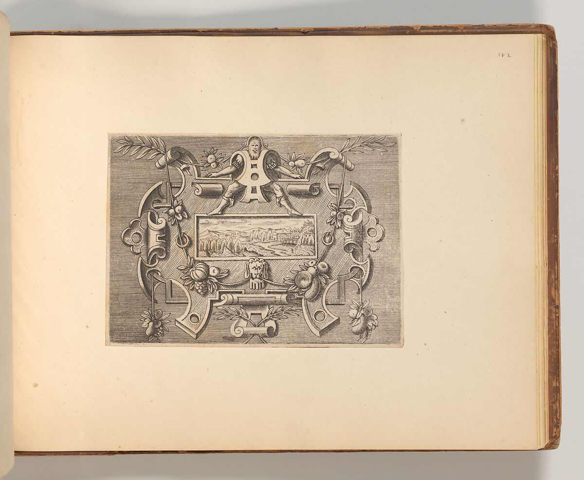 This album contains several print series with designs for strapwork cartouches. The first half of the album consists of plates from the series "Targhe ed altri ornate d varie e cappriciose invenzione (…)", published in Rome by Carlo Losi in 1773. The series is made up out of Italian copies in reverse after several print series originally published in Antwerp in the sixteenth century. The Italian copies were likely made soon after, likely in the context of Antonio Lafreri’s publishing ventures in Rome. Losi obtained the old plates combined them into one series of twenty-five prints. The title plate and following eleven prints are copied after the series "Veelderhande cierlijcke Compertimenten (…)", designed by Jacob Floris and published by Hans Liefrinck in 1564. These are followed by copies in reverse (with some alterations) after Hans Vredeman de Vries’ series "Variarum Protractionum", first published by Gerard de Jode in 1555. Most, but not all of these plates, are accompanied by a second impression of the same print on the facing page. These are darker in tone, and pasted onto a thicker sheet of paper, rather than printed directly onto the album page. They may derive from an earlier edition of the Italian series, although they do not contain inscriptions that refer to Lafreri or Iacomo Marucci who are known to have owned the plates before Losi. In one case, Losi’s plate is combined with a copy in reverse in a less accomplished hand. The second half of the album consists of a series of smaller prints containing strapwork cartouches with masks and short inscriptions in French, often attributed to Cornelis Bos. However, two versions of this series were produced during the sixteenth century: one with the cartouches on a blank ground, and one with the images in reverse and presented on a hatched ground. The latter versions is the one included in this album, which is further distinguished by the fact that it features landscapes instead of inscriptions in those cases where the compartment was filled with a text alone. This feature is reminiscent of various prints of the so-called School of Fontainebleau. One outlier is formed by a cartouche with and alphabet in majuscules. The design of the cartouche is close to those designed by the enigmatic artists Benedetto Battini for Hieronymus Cock’s 1553 series of strapwork cartouches with quotations in Latin, but it is not a copy. This print is signed with the initials of the French artist Georges Reverdy, which has previously led to the idea that Reverdy might be the artist responsible for the entire series of cartouches on a hatched ground. The difference in the execution of the prints speaks against this hypothesis, however.