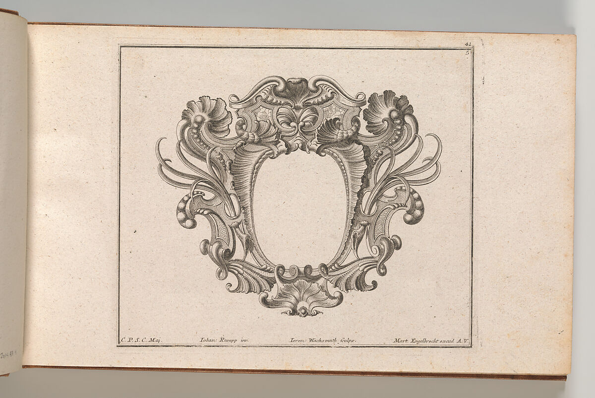 Ornament print with a design for a cartouche, bound in an album containing 27 series with a total of 122 ornament prints from the fund of the prominent Augsburg publisher Martin Engelbrecht.