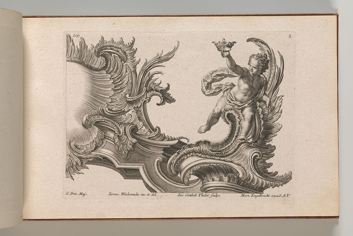- Title: Design for a Rocaille Cartouche with the Figure of a Putto, Plate 3 from an untitled series with architectural cartouches and allegorical figures