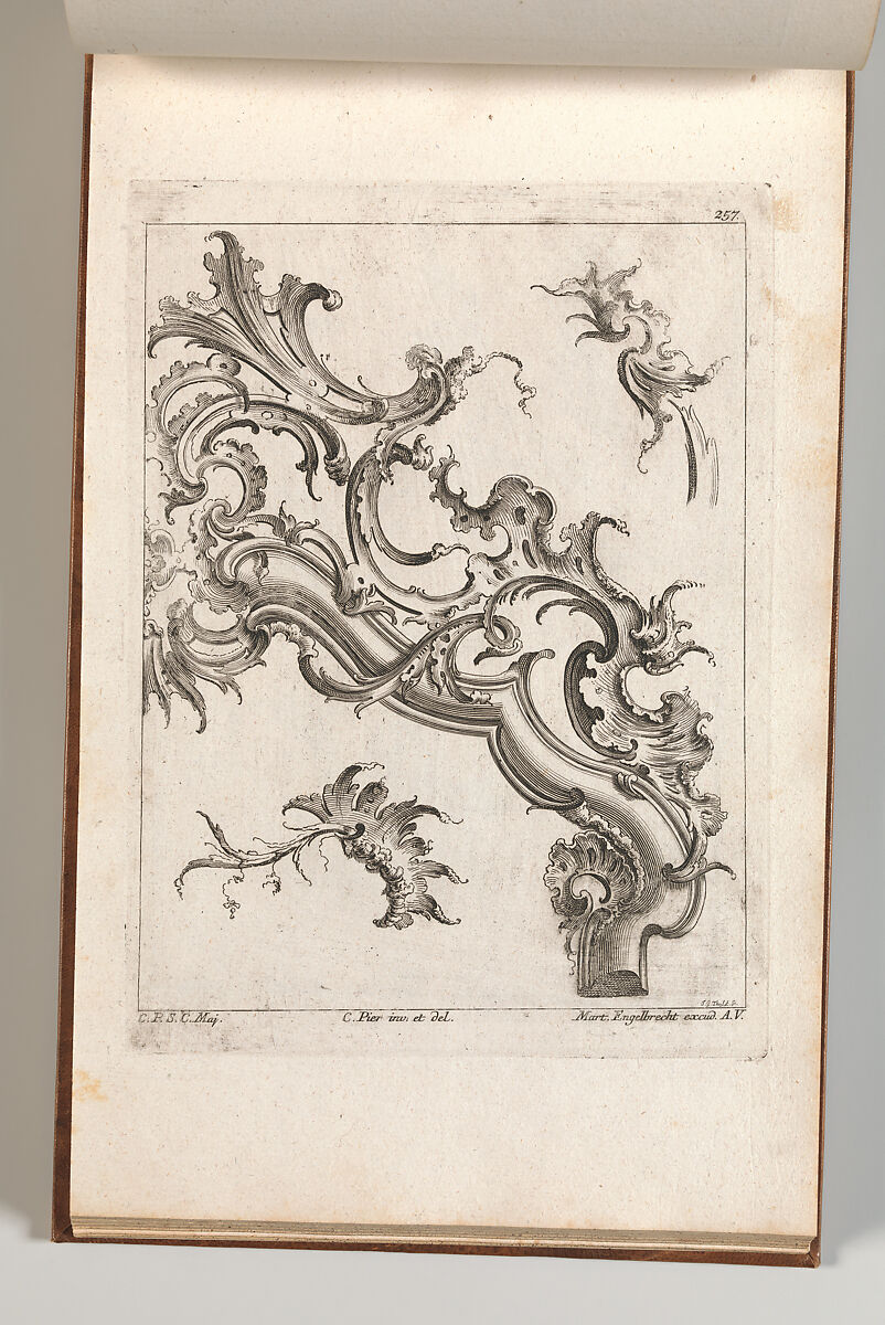 Ornament print with designs for rocaille ornaments, including one large ornament forming the top right corner of a frame or arch and two loose rocailles. This print is bound in an album containing 27 series with a total of 122 ornament prints from the fund of the prominent Augsburg publisher Martin Engelbrecht.