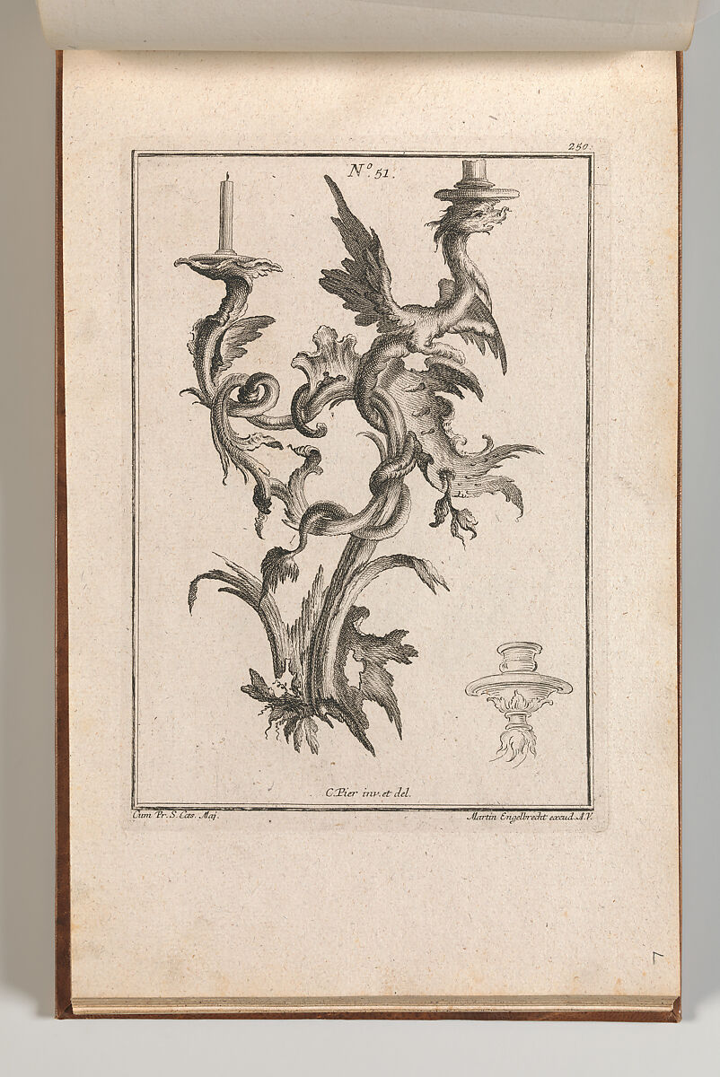Ornament print with a design for a two-armed candelabra, with a little dragon supporting one of the candles. In the lower right corner the outline of sconce has been added. This print is bound in an album containing 27 series with a total of 122 ornament prints from the fund of the prominent Augsburg publisher Martin Engelbrecht.