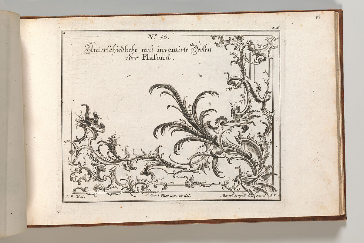 Ornament print with a design for the decoration of the lower right corner of a ceiling with thin elegant rocaille motifs and the offshoot of a plant in the corner. This print is bound in an album containing 27 series with a total of 122 ornament prints from the fund of the prominent Augsburg publisher Martin Engelbrecht.