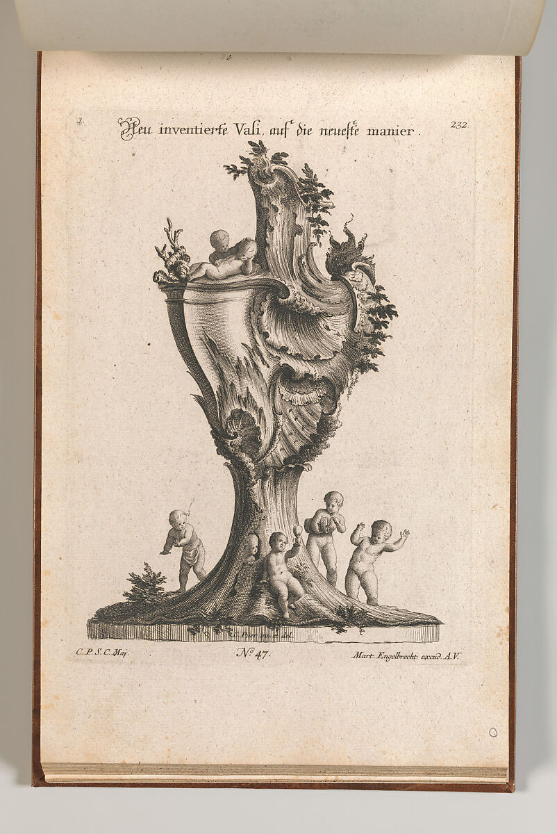 Ornament print with a design for a monumental lidded vase, decorated with rocaille ornaments in high relief and surrounded by 8 putti. This print is bound in an album containing 27 series with a total of 122 ornament prints from the fund of the prominent Augsburg publisher Martin Engelbrecht.