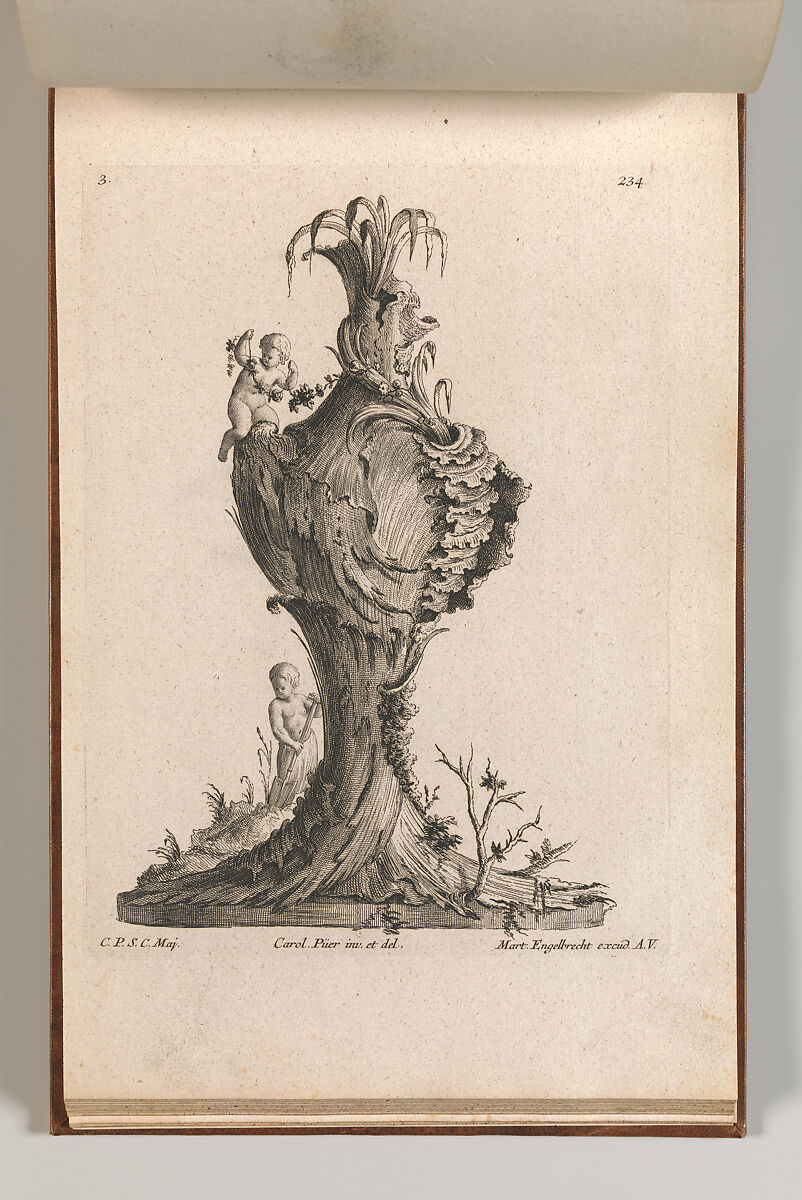 Ornament print with a design for a monumental vase, decorated with rocaille ornaments and 2 putti, one of which is sitting on the vase with a garland of flowers. The vase is meant to represent the element 'Earth'. This print is bound in an album containing 27 series with a total of 122 ornament prints from the fund of the prominent Augsburg publisher Martin Engelbrecht.