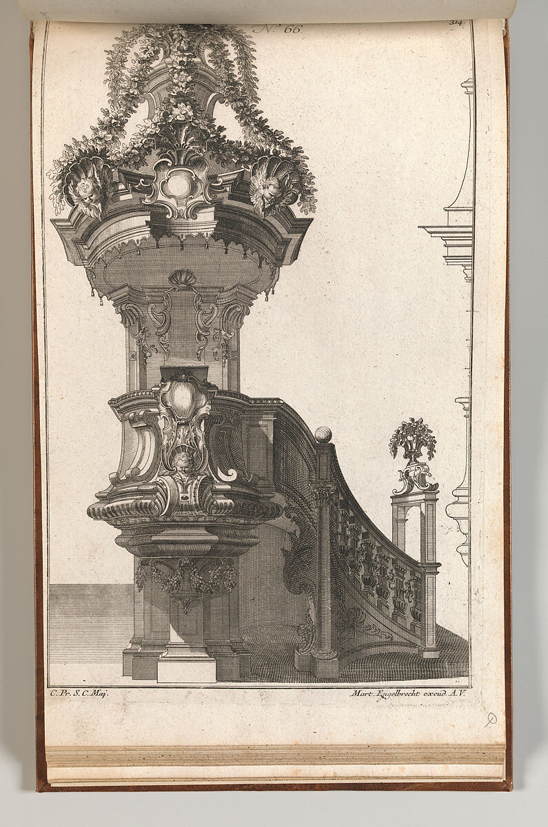 Ornament print with a design for a pulpit, shown in frontal elevation and with a silhouette of the side elevation on the right side of the sheet. This print is bound in an album containing 27 series with a total of 122 ornament prints from the fund of the prominent Augsburg publisher Martin Engelbrecht.