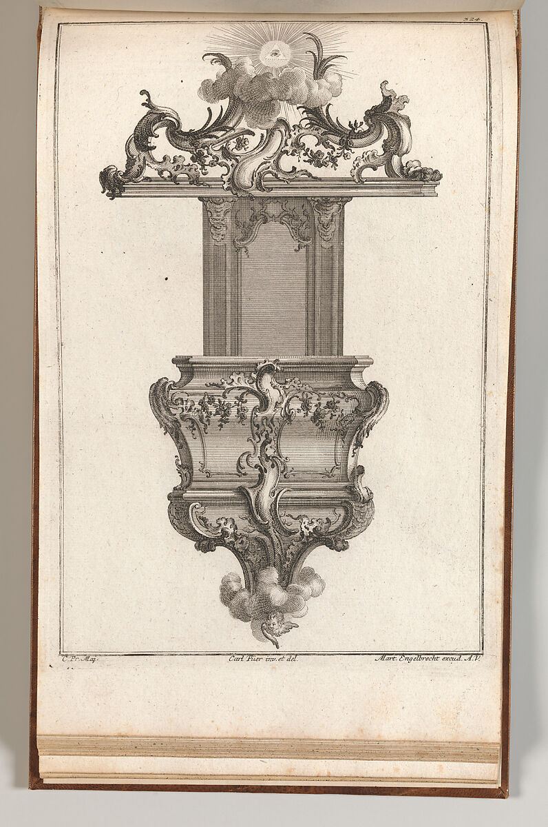 Ornament print with a design for a suspended pulpit shown in frontal elevation. The pulpit is characterized by a baldachin of rocaille ornaments leading up to the all-seeing eye of God, surrounded by rays of sunshine. This print is bound in an album containing 27 series with a total of 122 ornament prints from the fund of the prominent Augsburg publisher Martin Engelbrecht.