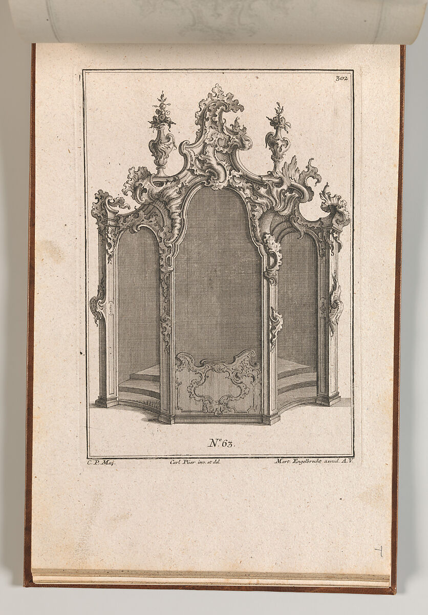 Ornament print with a design for a confessional in frontal elevation. The confessional is symmetrical in shape and is decorated with rocaille ornaments and 2 vases on top. This print is bound in an album containing 27 series with a total of 122 ornament prints from the fund of the prominent Augsburg publisher Martin Engelbrecht.