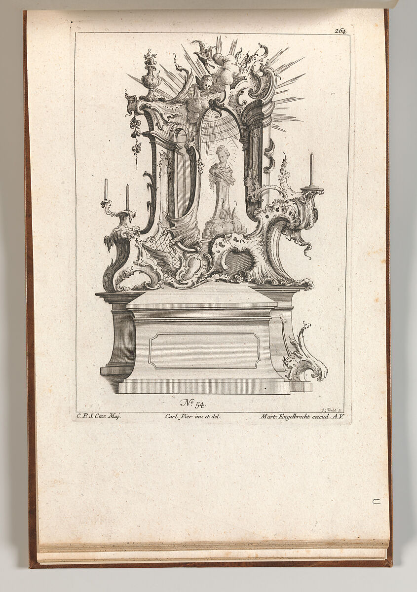 Ornament print with a design for an altar in frontal elevation. The base of the altar is left undecorated, safe for a small rocaille ornament in the right variant. The top of the altar is heavily decorated with rocaille ornaments and candelabras and characterized by a bust on a pedestal depicted in the central opening or niche. This print is bound in an album containing 27 series with a total of 122 ornament prints from the fund of the prominent Augsburg publisher Martin Engelbrecht.