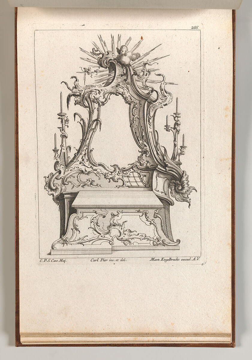 Ornament print with a design for an altar in frontal elevation. The design shows two variants for the base below the altar table. The top is slightly asymmetrical, but does not apear to show variants. It is flanked by large candelabras on either side and is crowned by a cherub surrounded by rays of sunlight. This print is bound in an album containing 27 series with a total of 122 ornament prints from the fund of the prominent Augsburg publisher Martin Engelbrecht.