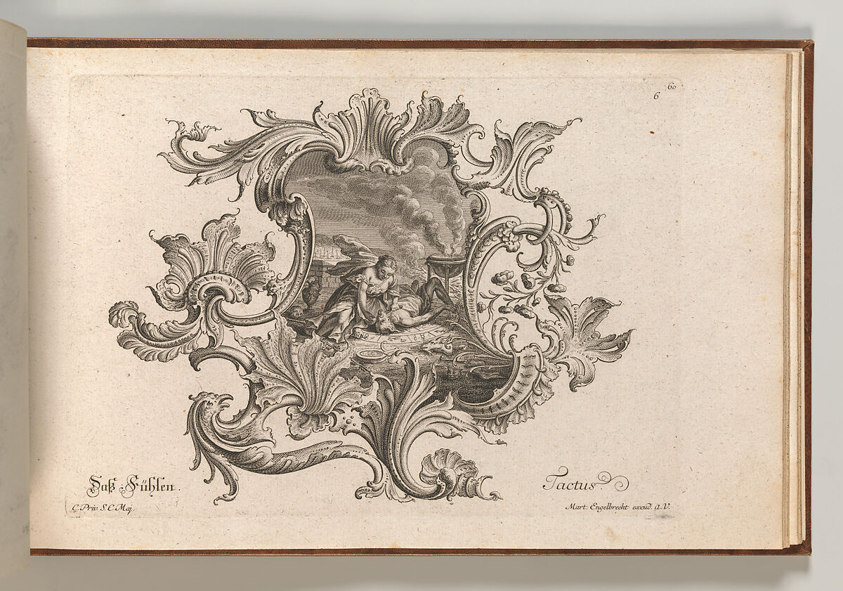 Ornament print with a design for a rocaille cartouche, with a depiction of a ritual scene in which a woman cuts a man's throat (either Medea and Aeson, or alternatively Pelias and one of his daughters) in the central compartment, to illustrate the sense of 'touch'. This print is bound in an album containing 27 series with a total of 122 ornament prints from the fund of the prominent Augsburg publisher Martin Engelbrecht.
