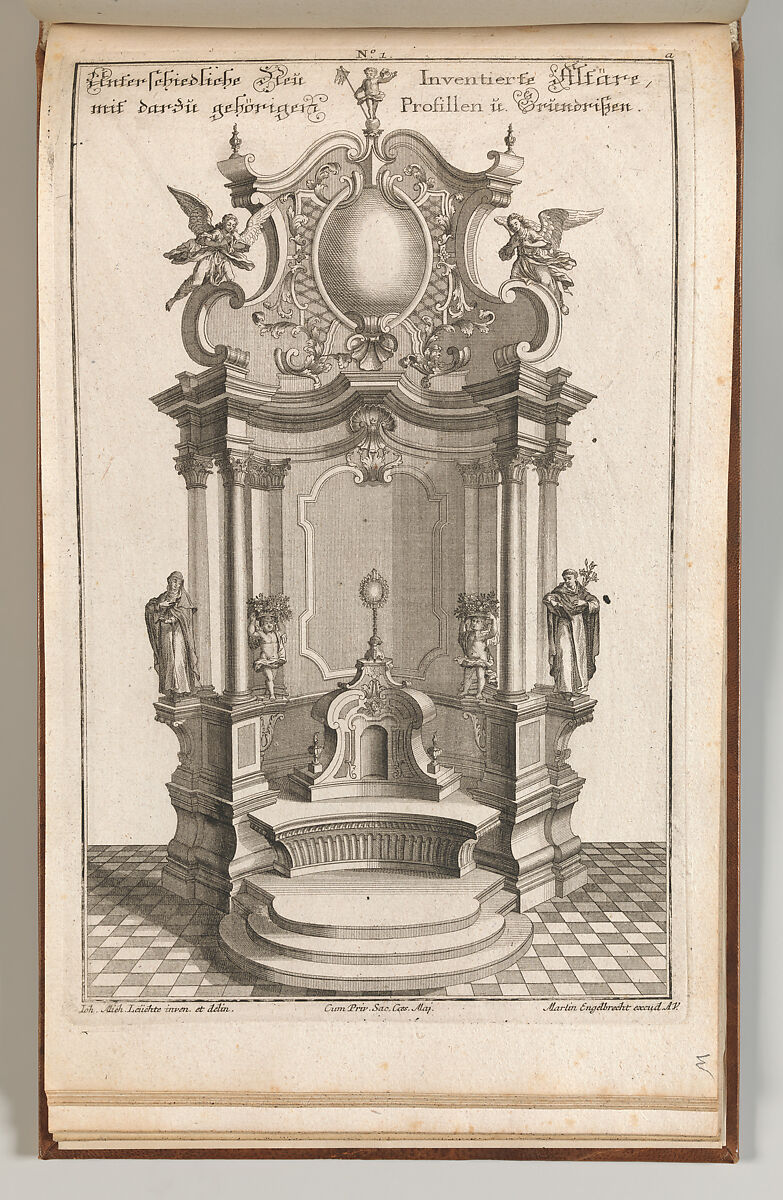Ornament print with a design for a monumental altar in a late Baroque style, with statues of Catherine of Siena and Saint Dominicus. This print is bound in an album containing 27 series with a total of 122 ornament prints from the fund of the prominent Augsburg publisher Martin Engelbrecht.