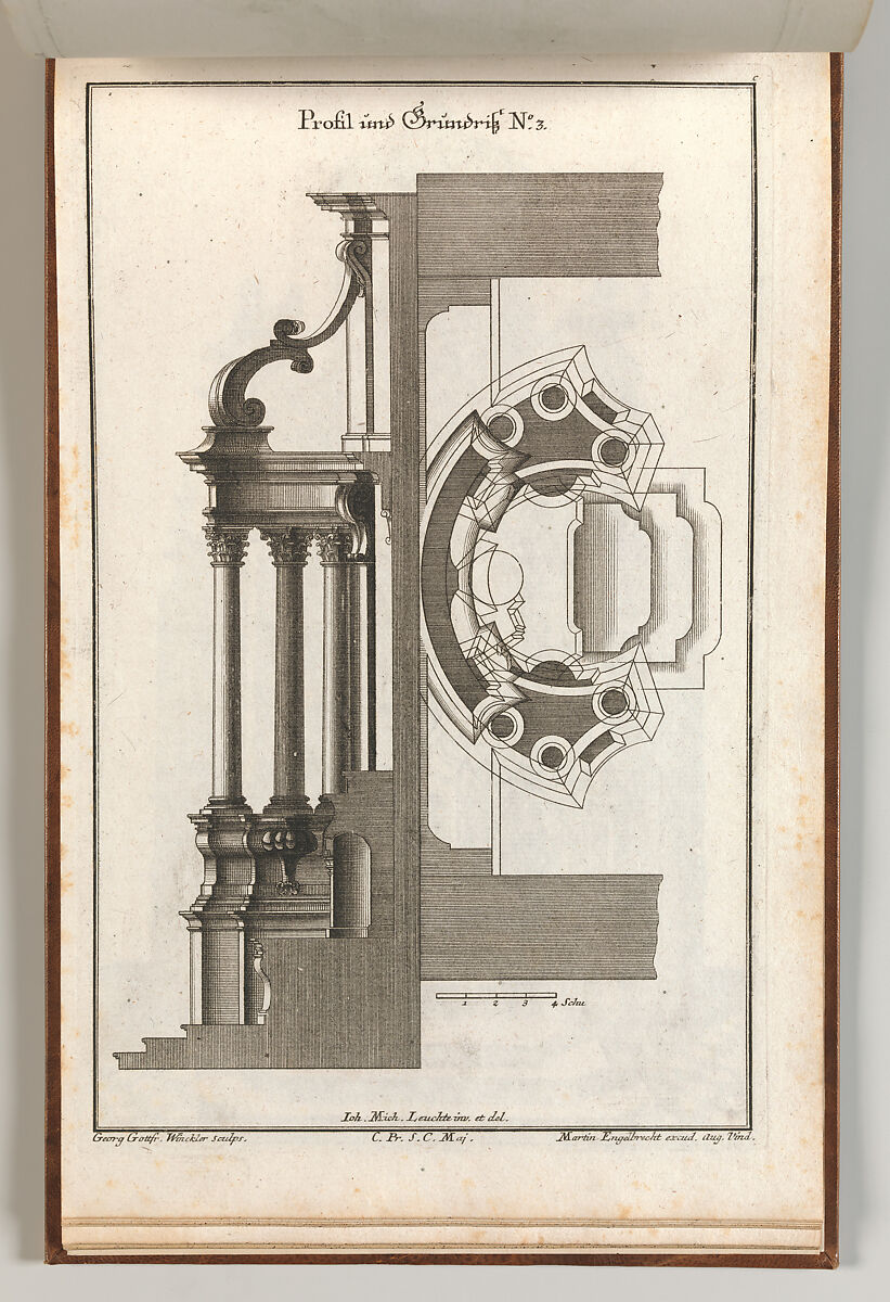 Ornament print with the side elevation and floorplan for the altar design in the previous print (altar in a late Baroque style, with a statue of the Virgin Mary above the altar table). This print is bound in an album containing 27 series with a total of 122 ornament prints from the fund of the prominent Augsburg publisher Martin Engelbrecht.