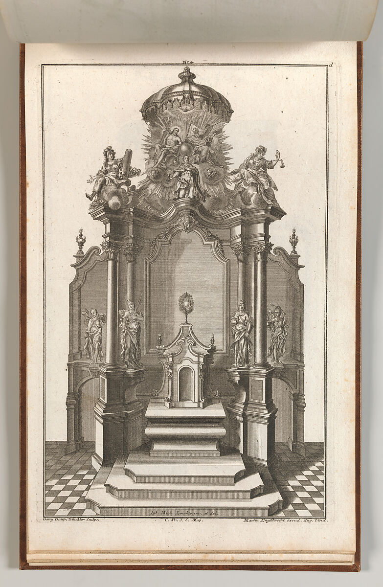 Ornament print with a design for an altar in a late Baroque style, with a large architectural reliquary on the altar table, flanked by four statues of female personifications of the Cardinal Virtues. This print is bound in an album containing 27 series with a total of 122 ornament prints from the fund of the prominent Augsburg publisher Martin Engelbrecht.