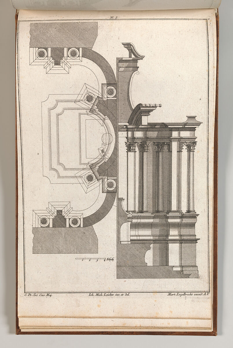 Ornament print with the floorplan and side elevatio for the altar design presented in the previous print (altar in late Baroque style, with a large architectural reliquary on the altar table and a representation of the Holy Trinity above). This print is bound in an album containing 27 series with a total of 122 ornament prints from the fund of the prominent Augsburg publisher Martin Engelbrecht.