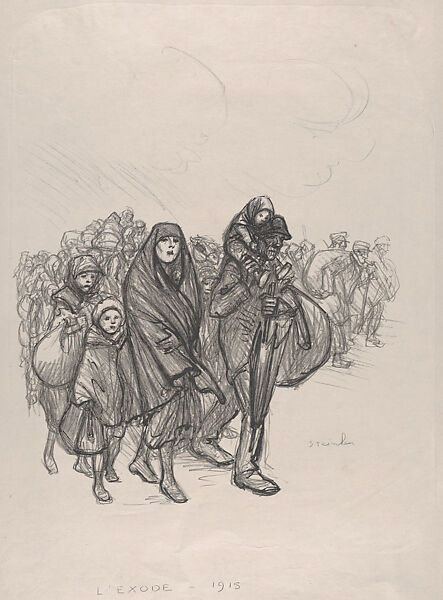 Steinlen, who moved to Paris from Brussels in 1881, had a lifelong concern with the plight of the working class and marginalized populations. The subject of displaced people appears frequently in his wartime work. Between 1914 and 1915 nearly two hundred thousand refugees fled Belgium; this print, also called The March of the Orphans, depicts an exodus after a German attack. A stoic mother holding an infant leads a sea of children. Individualized subjects in the foreground give way to faceless figures in the background, which Steinlen suggests with quick, sweeping lines that blend into the vast horizon. The mother’s eyes fixate with strength and despondence on the distant unknown, while the children’s expressions remain ambiguous and unsure. The landscape behind them is suggestive of their displacement and migration from home.