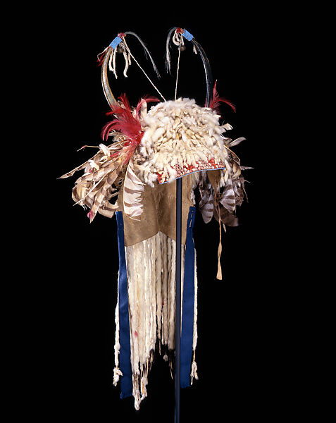 This work of art is currently on loan to the museum.Horned bonnets were worn by members of the Bull society, which honored the buffalo spirits in its ceremonies. A warrior had to receive spiritual instruction from a dream or a mystical experience in order to acquire the right to make such a headdress. Songs related to the privileges of wearing the bonnet were conveyed in the same manner.