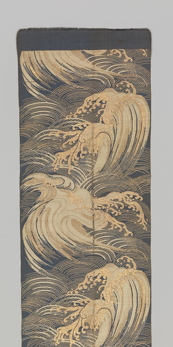 Dramatic waves rendered in gold and silver metallic threads and white and greenish blue silk crash and splash all over the surface of this obi. It is woven in a double-cloth weave that was very popular for obis in the Meiji period.