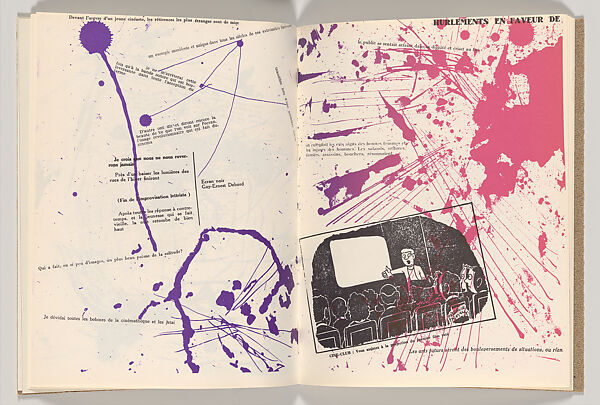 Mémoires was the second collaboration between the writer, activist, and founder of the Situationist International Guy Debord and the artist Asger Jorn; in 1957 they had created Fin de Copenhague, an illustrated book that was allegedly made in a twenty-four hour period. Mémories represents a radical rethinking of the illustrated book, as well as genres such as biography, history, and the artist’s book. It tells the intellectual autobiography of Debord, then twenty-six years old, and the creation of the Situationist International. Rather than written passages, the book is constructed through détourned or repurposed found materials, such as newspaper clippings, photographs, cartoons, and advertisements, as well as quotations from figures who included Marx and Huizinga, as well as the popular press. Eschewing a strict vertical and horizontal orientation, the book instead proposes an all-over viewing, as if navigating a map, yet with no direction given. In this way, it evokes the Situationist concept of psychogeography, as well as the dérive, or found object. Jorn, associated with the CoBrA movement (derived from the first letters of the artists' towns of Copenhagen Brussels, and Amsterdam) created gorgeously lush ink splatters, skeins, and other marks in bright colors that visually link fragments of text and images, while also evoking gestural abstractionists such as Jackson Pollock. The desire of Debord and Jorn to challenge the conventions of fine art and the collectable object is visible in the famous cover, which, constructed out of sandpaper, was intended to destroy the covers of all other books in the owner's library.