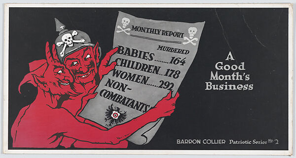 Propaganda poster showing a devil and Kaiser Wilhelm II, who is also depicted as a devil, looking at a monthly report of death totals. This idea that the Kaiser was a figurative devil was a popular theme in American, British, and French propaganda.