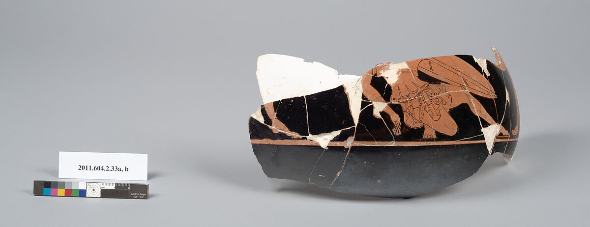 The larger fragment depicts, at the left, part of the left greaved calf and foot of a warrior to right; part of an inscription, ...MACHE; the lower torso, legs, and right arm of a warrior falling backwards, wearing a chitoniskos and greaves, holding a shield in his left hand; part of an inscription, ...TIS; left leg, with greave and shield of a warrior to left; the second smaller fragment depicts a bit of the top of the greave and knee of a warrior to right; the lower torso and legs of a warrior wearing a chitoniskos, crouching to left