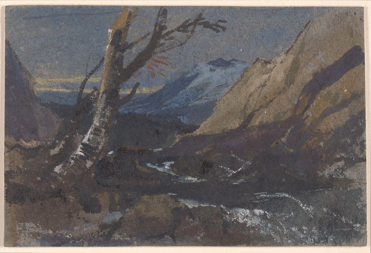A leader of the Bristol School, Müller’s life was cut short by illness at the height of his powers. Influenced by the expressive naturalism of John Sell Cotman, whose works he studied in the collection of a friend, the Rev. James Bulwer, Müller sketched out of doors in all weathers. In the 1830s he traveled to Europe and the Middle East, but likely found the present subject closer to home. The mountains of Wales were not far from Bristol, and Muller visited them in the winter of 1842 and autumn of 1843. The sparse leaves clinging to a branch in this drawing link the work to the latter tour, while the free execution is characteristic of the artist’s late style.