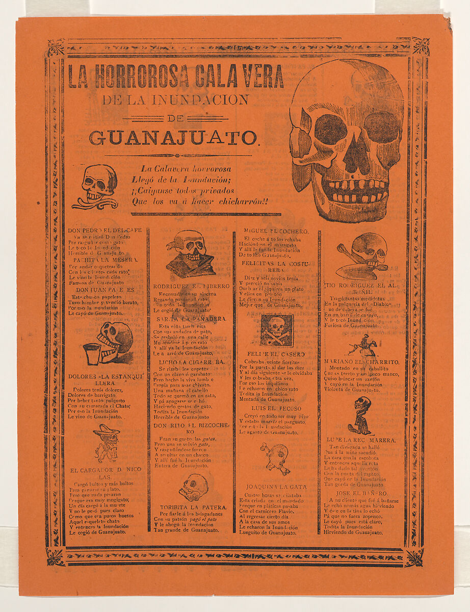 Beginning on June 30, 1905, torrential rain fell on Guanajuato for two days, causing a nearby dam to burst and flood the city. More than two hundred people died, and the city’s infrastructure suffered significant damage. News of the disaster circulated in the local and international press, reaching the New York Times on July 4; it was also covered in the flyers and broadsheets of the Mexican illustrated press. This satirical print with art by Posada offers short fictional stories about the mischievous behavior of those who died in the flood.