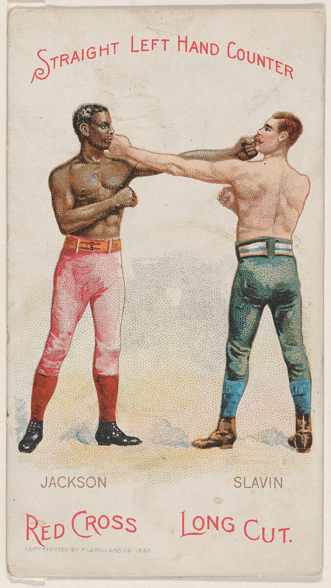 - Title: Straight Left Hand Counter, Peter Jackson and Fred Slavin, from the Boxing Positions and Boxers series (N266) issued by P. Lorillard Company to promote Red Cross Long Cut Tobacco