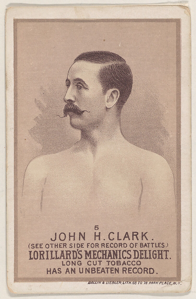 Card 5, John H. Clark, from the Prizefighters series (N269) issued by P. Lorillard Company to promote Mechanics Delight Long Cut Tobacco