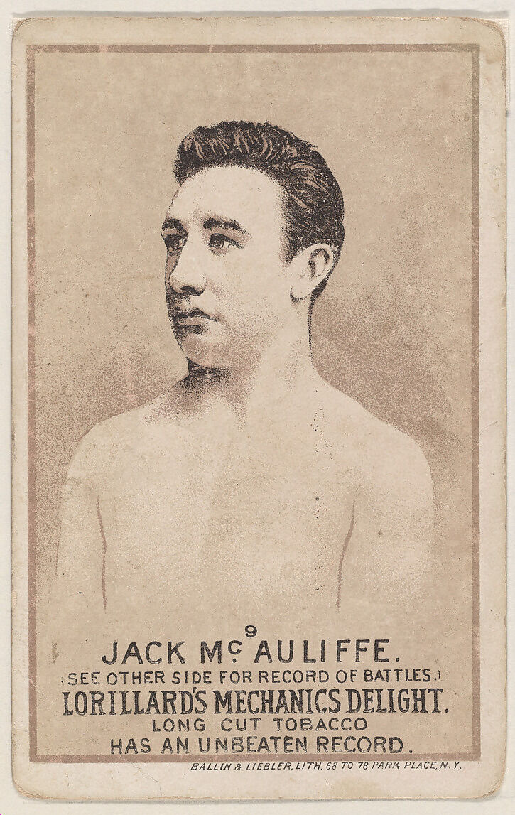 - Title: Card 9, Jack McAuliffe, from the Prizefighters series (N269) issued by P. Lorillard Company to promote Mechanics Delight Long Cut Tobacco