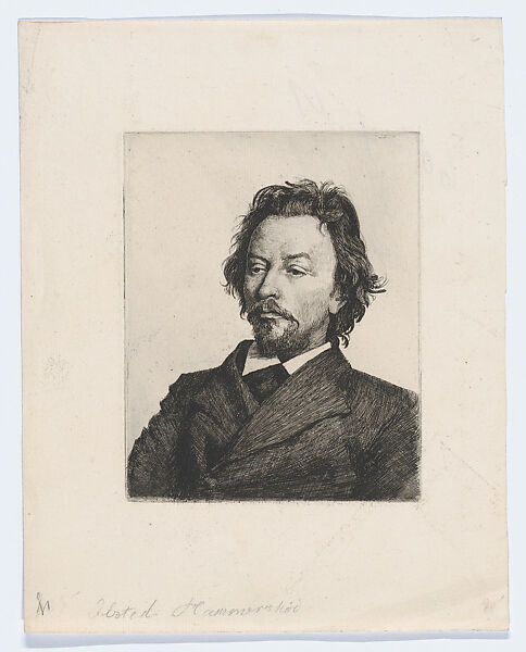 This portrait follows the common Danish practice of depicting artists from the chest up against an almost blank ground. Expertly wielding the etching needle, Ilsted created a convincing portrayal of the unruly long hair, goatee, and beard Hammershøi favored later in life. This image echoes the stiff, formal profile pose the artist assumed in a photograph from about the same time. The print, rich in chiaroscuro, shows Hammershøi looking off evasively into the distance with his eyes half-open, suggesting someone lost in his own elusive thoughts.