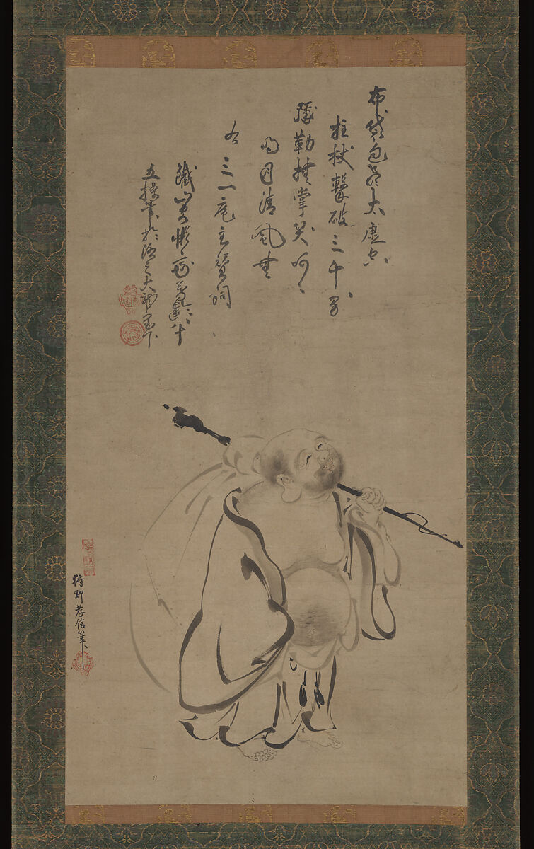 Hotei, a popular figure in the Zen pantheon, is often depicted as a rotund, good-humored monk carrying a large sack. A semihistorical figure, he is believed to have lived in southern China in the late ninth century and was eventually recognized as a manifestation of Miroku, Buddha of the Future. The poetic text here, from a eulogy for Hotei by the Chinese Daoist Bai Yuchan (1194–1229), was inscribed by Tetsuzan Sōdon, a leading monk-scholar who served as abbot of the Zen monastery Myōshinji in Kyoto.