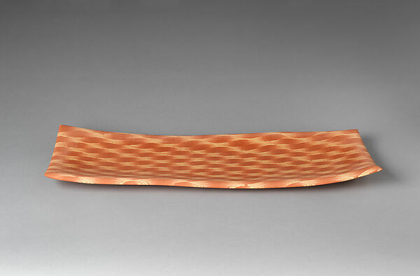 This large rectangular plate, with a variant of checkered pattern in contrasting colors of clay, is a product of the Sekisui family kiln in Aikawa, on Sado Island. The artist, Itō Sekisui V, is the 14th generation craftsman in a family of potters; he was designated a Living National Treasure by the Japanese government in 2003. Like his Itō family predecessors, he works with a type of ochre clay called mumyōi, a byproduct of Sado Island’s gold mines. Red mumyōi clay contains a high level of iron oxide and fires to a deep rusty-red shade, as seen in this vessel. Sekisui is a skilled master of neriage, one of his signature techniques, which involves kneading or wedging different colored clays together and then slicing cross sections to reveal a marbled pattern. The sliced clay is then pieced together, resulting in ceramics that have the appearance almost of painted wares.