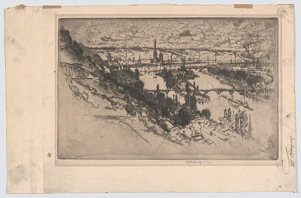 After a visit to the French cathedral towns of Rouen, Beauvais and Amiens in 1907, Pennell produced this sweeping river view where steep terraced slopes plunge at left, and a winding river leads the eye toward the distant city. The foreground is punctuated by man-made elements—bridges and a train viaduct—constrasting with the distant medieval city and its gothic towers. Within a year, the artist would move to New York and address the booming urban scene in America with a sensibility honed by appreciation for medieval precedents.
