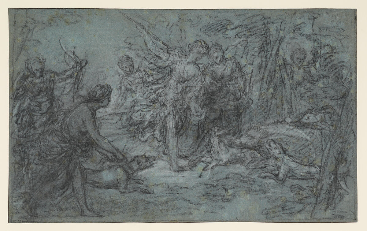 This vigorous sketch is a première pensée, or first idea, for an overdoor commissioned by Louis-Alexandre, comte de Toulouse for the Cabinet du Roi at the château de Rambouillet. The painting, today in the Musée des Beaux-Arts of Tours, depicts Diana and her nymphs hunting a wild boar. A second, more detailed but also drier, compositional study is in the Musée du Louvre. In this freely executed sketch, the artist uses black and white chalk, not only to lay in the major elements of the composition, but also to consider the overall distribution of light and dark.