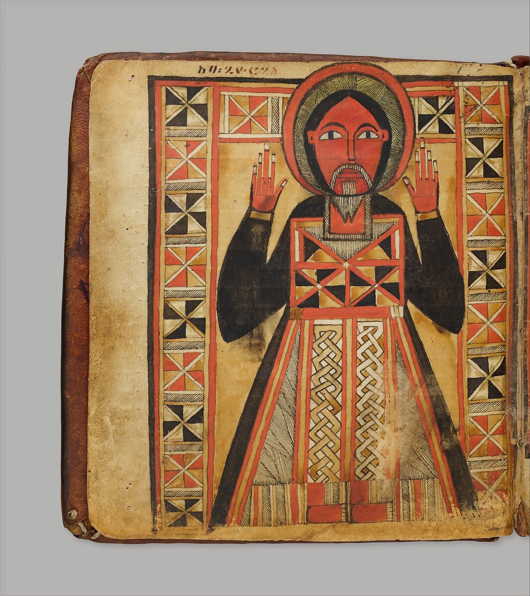 Abba Giyorgis of Sägla is traditionally credited with writing this hymn of praise to the Virgin Mary in the fifteenth century. Venerated as a saint, Giyorgis of Sägla was a major fifteenth century author of religious texts written in Gə’ez, the liturgical language of the Ethiopian Orthodox church. He is depicted in the illumination on the reverse of the first folio (1v). His oval-shaped head, hair, turban and halo nest within one another. The sense of expanding form is enhanced by alternating flat planes of red and black with thin hatching. Crescent-shaped black eyebrows frame the half-moon eyes, their sloping forms echoed below by the long mustache. The saint wears a long triangular black robe, the hem lifted to reveal bare feet turned at right angles from the ankles. The upper part of his scapular, an apron-like religious garment worn atop the black robe, is patterned with fields divided by a central cross into eight triangles, and then again by a cross set on the diagonal. This motif is called a "gyronny," and repeats both in the border of this illumination and throughout the work. Thin hatching brings lightness to both the robe and in the border, interrupting the otherwise matte planes of color. Posed in the orans position, a gesture of raised hands with upturned palms. The oversized hands and extended fingers with prominent nails (or finger pads) exaggerate his prayerful stance. Rather than the three-quarter pose favored by Ethiopian artists from the seventeenth century onwards, its frontal pose reflects those typically used in fifteenth century Ethiopian manuscripts. This depiction appears to be a kind of convention that the artist of this manuscript developed for depicting sacred figures. Modifying little more than the pattern of their robes, or their placement within the composition, he employed it in other religious works to depict saints like Luke the Evangelist, Täklä Haymanot, and Gäbrä Mänfäs Qəddus. If not for the identifying caption written inGə’ez above his head, the figure depicted in the Metropolitan’s manuscript would be impossible to distinguish from those other holy men.Though dedicated to the Virgin Mary, one of Ethiopia’s most popular saints, this work does not include her image, unlike other religious texts dedicated to her.